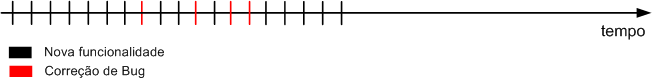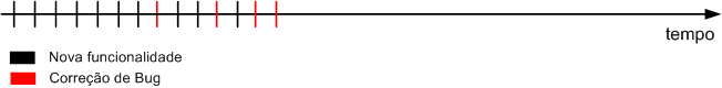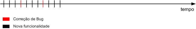 - Com o decorrer do tempo, encontram-se bugs no software (que podem ser de estabilização ou de produção). Esses bugs são corrigidos (linha vermelha cortando a linha do tempo).