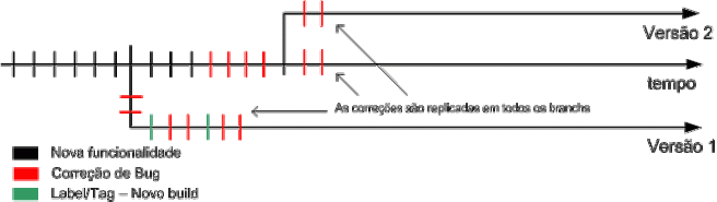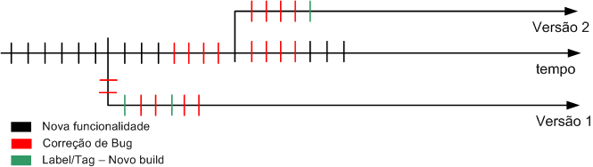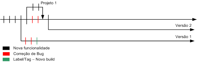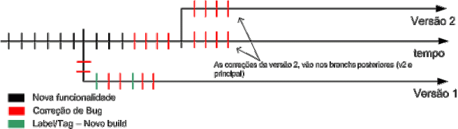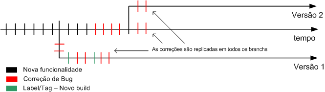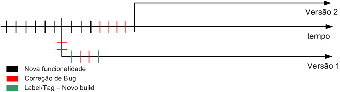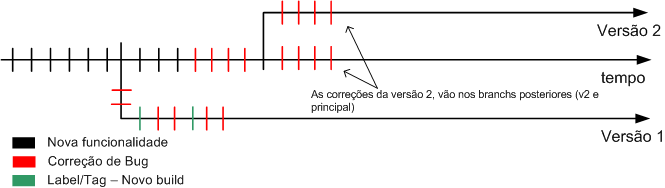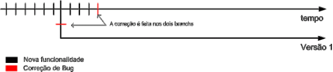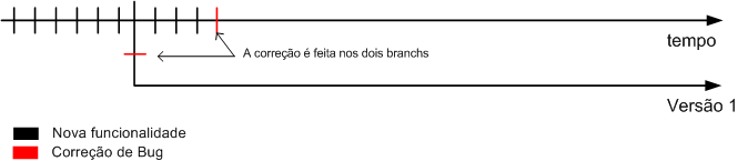 Se nesse momento ocorrem bugs na versão 1, ele é corrigido e replicado na versão 1, versão 2 e linha principal de desenvolvimento.