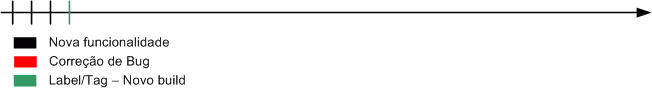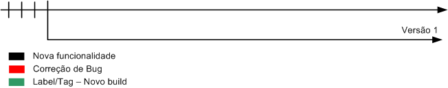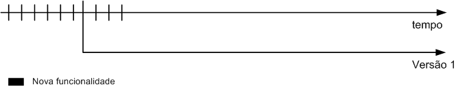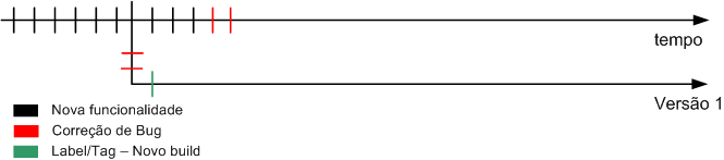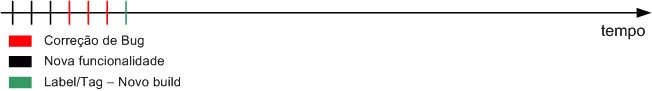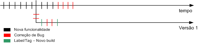 - Com o decorrer do tempo, o software vem criando novas funcionalidades (linhas pretas cortando a linha do tempo). Para cada nova funcionalidade é feita uma alteração no código fonte (que pode ser em um ou mais arquivos).