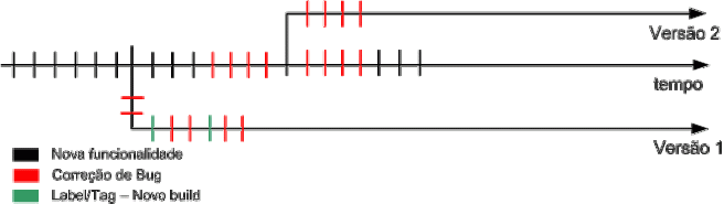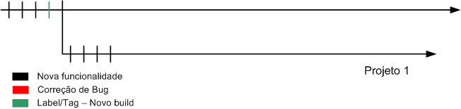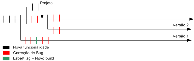 Assim, ficamos com o branch “Versão 1”, com a versão em estabilização “congelada”, ou seja, nos livramos daquele problema “não estabiliza nunca, porque não para de mexer”. Na linha principal de desenvolvimento fica a última versão, com mais features, porém, mais instável.