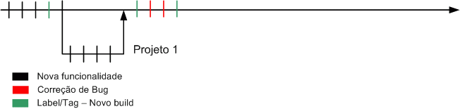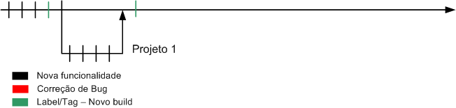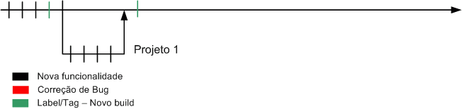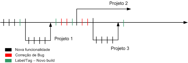 - Durante a estabilização de uma versão 1, novas funcionalidades são adicionadas na linha principal de desenvolvimento, referentes a dois projetos, projeto A e projeto B.