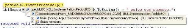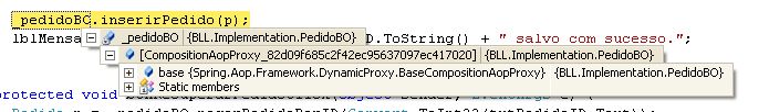 No nosso primeiro breakpoint, em default.aspx.cs, verificamos no método inserirPedido que a instância que recebemos de _pedidoBO é de um tipo “esquisito”: