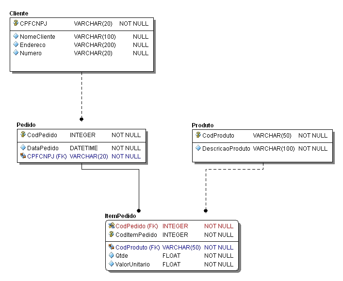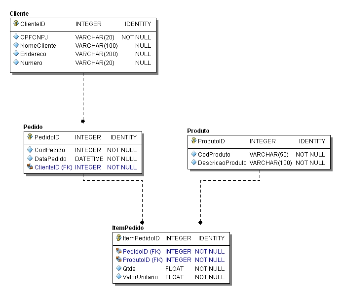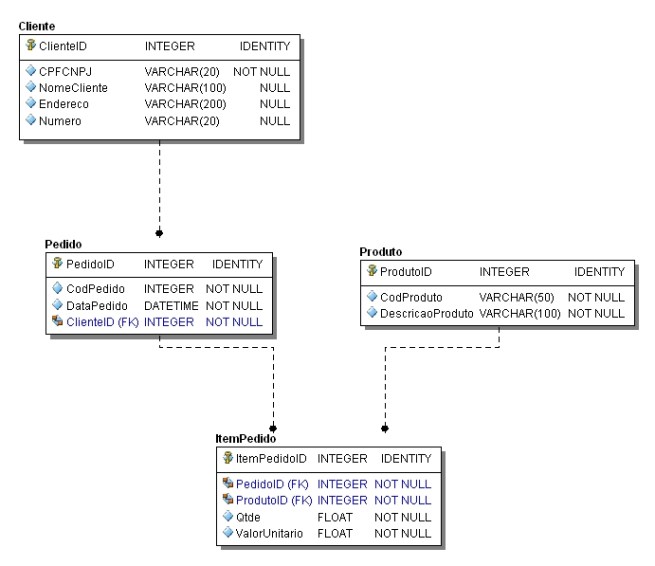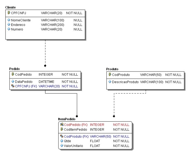 - Cada pedido possui “n” itens. Aqui ocorre um relacionamento master/detail ou pai/filho entre essas tabelas.