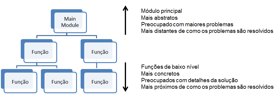 “Imagine um design estruturado que consiste em módulos dispostos através de uma árvore. A raiz da árvore é o módulo principal. Os nós da árvore são módulos utilitários que atendem funções de baixo nível. A árvore representa uma hierarquia de chamadas. Cada módulo chama o módulo que está imediatamente abaixo e é chamado por módulos imediatamente acima.