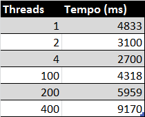 Em seguida, executei o exemplo acima com 1, 2, 4, 100, 200, 400 threads, na minha máquina que possui 4 cores (2 cores físicos, 4 processadores lógicos). Os resultados estão abaixo:
